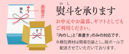 のしをご希望の方は、「熨斗の選択(無地または表書き)」を選択後に商品をカートに入れてください。「内のし」と「表書き」のみの対応となります。(「名前書き」は対応しておりません。) 梱包資材はできる限り簡易包装とし、段ボールで配送させていただいております。ご理解のほどお願い申し上げます。
